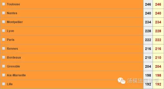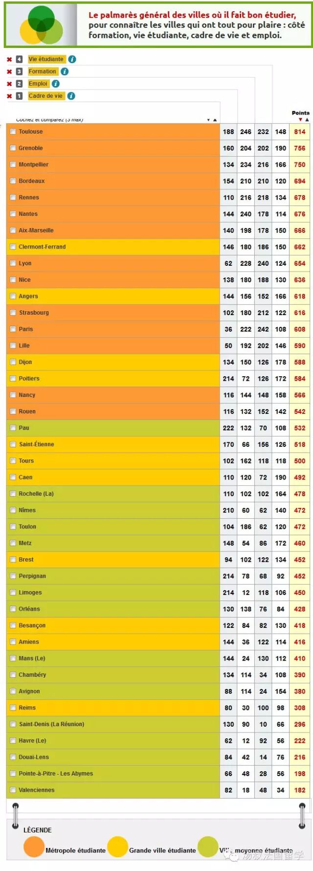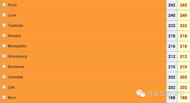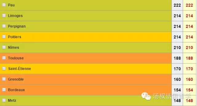 接下来看一看城市环境的维度。这方面会参考学生是否能方便的找到住房、城市交通是否便利、城市的生活环境和治安,等等。这份榜单排名榜首的是名不见经传的波城,随后依次是利摩日、佩皮尼昂、普瓦捷、尼姆、图卢兹、圣埃蒂安、格勒诺布尔、波尔多和梅斯。