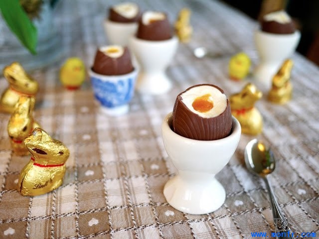 1. Trempez votre couteau dans de l'eau bouillante. Coupez délicatement les œufs au chocolat de sorte à ce qu’ils aient un effet « cassé » . Mettez le tout au réfrigérateur.把你的刀浸入沸水中,轻巧地把巧克力蛋切成破碎的效果。全部都放进冰箱里。
