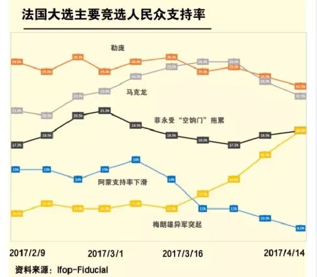 《费加罗报》4月20日报道,民调机构Ifop最新的调查(于4月17日4月20日展开的调查)数据显示,24%的被调查者有意愿在第一轮中将票投给马克龙,22%的人有意投给勒庞,19.5%的人有意投给菲永,18.4%的人有意投给梅朗雄。而阿蒙的投票意愿率仅为7%。