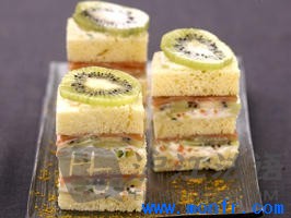 Coupez chaque sandwich en quatre, décorez le dessus avec un peu de fromage et une tranche de kiwi. 将每个三明治切为四份,分别在上面以奶酪、奇异果片装饰。
