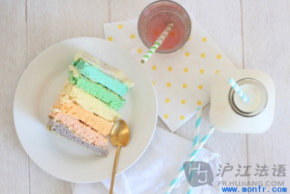 在粉红色蛋糕上抹上一层薄薄的糖霜,又将橙色蛋糕放下,之后对随后的蛋糕进行同样的操作:黄色、绿色和蓝色。