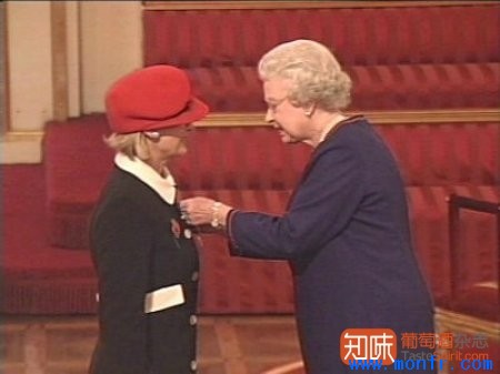 当然,我们有时也的确会为女王和她的宾客们品尝一些好酒。我们会在波尔多新的红酒上市时购买一批来自己陈年,因为这样可以节约开支,至少目前可以(注意此文撰写于2011年)。我们定期检查它们的发展情况,这是件相当有趣的工作,但是这些酒的发展速度比我自己酒窖里的慢很多。在女王的酒窖里我们还能时不时发掘出一些用来招待贵宾的年份香槟,以及勃艮第红酒和白葡萄酒。每每当我在个人网站上发布我向皇家葡萄酒委员会递交的品酒笔记时,总会有一些读者表示遗憾,因为他们觉得还可以更高档一些。经过思考之后我发现,这些抱怨者们基本都不是英国纳税人。(附上图片一张,这是我2003年五月第一次见到女王时的情景,她正在向我授予官方荣誉,之后不久我便受邀加入了皇家葡萄酒委员会)。