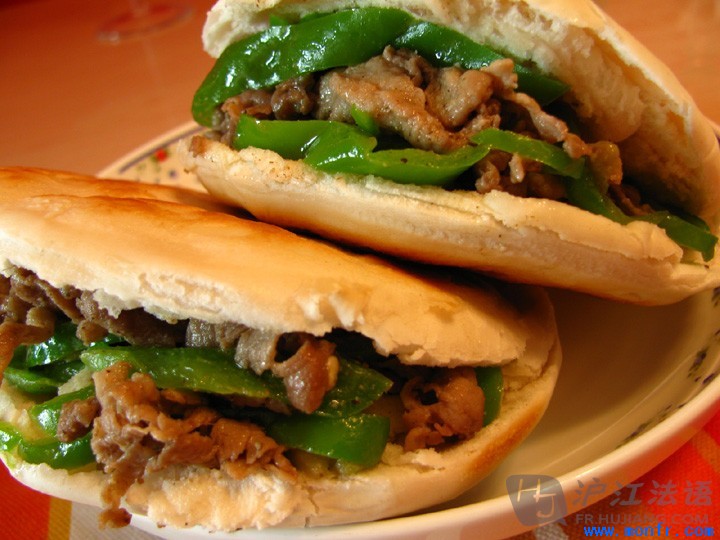 Le « Ròu jiā mó » est aussi connu sous le nom de « hamburger chinois ». C'est un plat fréquemment servi dans la province du Shaanxi. Pratiquement proposé à toute heure de la journée dans les restaurants de rue, le Rou Jia Mo est traditionnellement composé de viande (porc, agneau ou poulet) et de poivrons ou piments sautés.肉夹馍也叫“中式汉堡”,在陕西省十分常见,清晨马路两边的早点店中都会有得卖。传统意义上来说,肉夹馍中有肉(猪肉、羊肉或鸡肉)和青椒或炒辣椒。