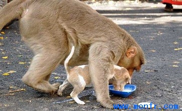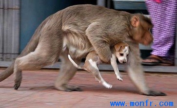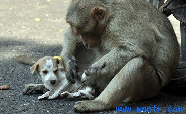 Voici une histoire d'amitié. Elle associe un macaque… à un petit chiot abandonné ! Les deux animaux se sont croisés dans les rues d'Erode, au sud de l'Inde. Depuis, ils sont devenus inséparables ! C'est bien simple, le singe est comme une mère pour le jeune chien : elle le nourrit, le protège, le promène et le soigne… Des images aussi étonnantes que magiques.这是一个关于友情的故事。故事的主人公是一只猕猴……和一只被遗弃的小狗!这两个动物在印度南部的Erode大街上相遇。从此以后,它们变得形影不离!事实十分简单,这只猴子对小狗而言如母亲一般:她喂他食物,保护他,带他散步并且精心照顾他……而这些照片对我们而言不仅是神奇更是震惊。