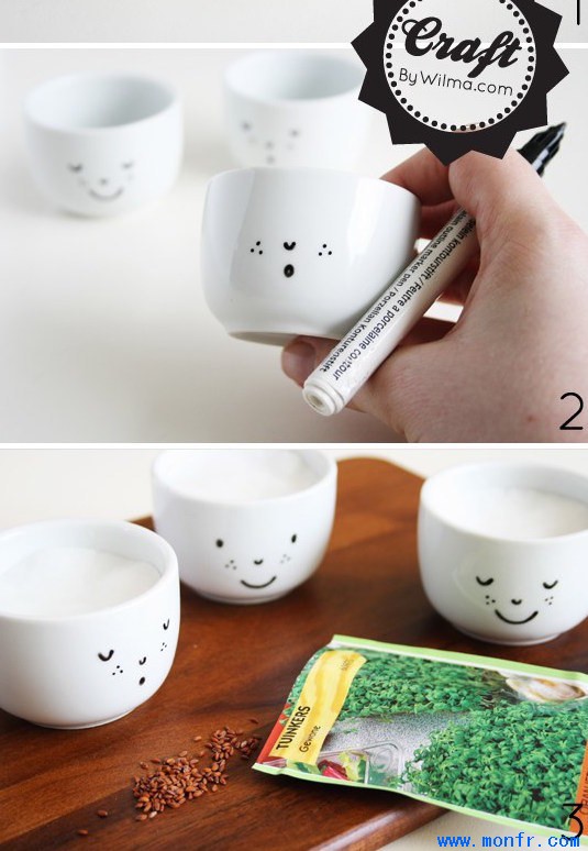 1. Dessiner des petits visages simples sur des tasses en utilisant un marqueur pour la céramique.用马克笔在陶瓷杯上画简笔笑脸。