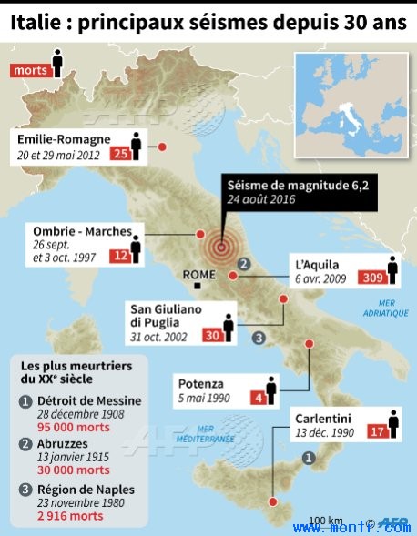 这篇报导紧贴科学角度,解释了为什么会发生地震,还有,为什么总是意大利地震……有点像科普文章,可以从文中学到很多科技词汇: 详细的大家可以自己阅读。文章引用的一张图我还挺感兴趣的,给大家贴出来,是意大利这些年发生的地震,还真不少啊,汗。 感兴趣的同学可以去搜搜来研究哦。