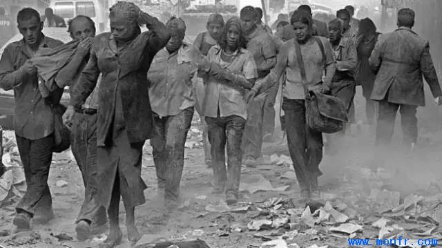 在曼哈顿,交通中断或几乎停滞。听从指示,南边的人们重新涌向北边。人群沉默而迷茫,有时候被笼罩上厚厚的一层灰尘。