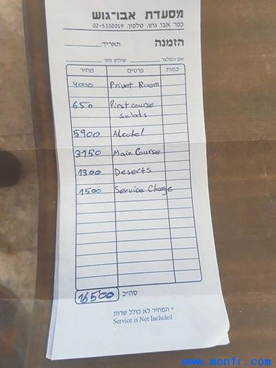 8个游客来到离耶路撒冷不远的小镇Abou Gosh,随意选了一间餐厅里拼餐。餐厅用餐的平均价格在17欧左右,然而在晚上用餐完后游客们惊讶的发现账单是3900欧。