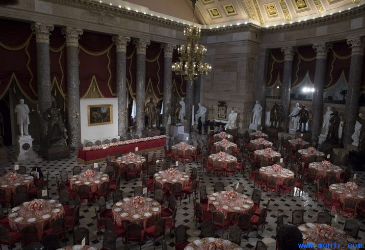 Direction l’intérieur du Capitole pour le déjeuner traditionnel avec les élus américans. Au menu, du homard sauce safran. 来到国会大厦内部,与宾客们共进午餐。菜肴有龙虾配藏红花。