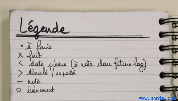 Le système de base repose sur un principe simple: on utilise des signes pour signifier l'état d'avancement d'une tâche que l'on a à faire.手帐原理基于一个简单的原则:用各种符号来标注需要完成的事情的进度。