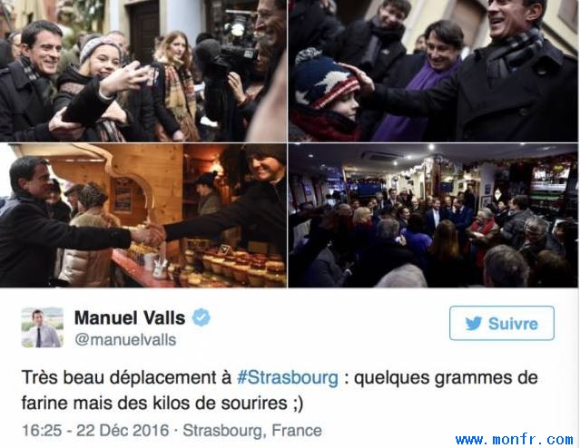 Manuel Valls, candidat à la primaire organisée par le PS, est enfariné par un homme au cri de "49.3 on n'oublie pas !" lors d'un déplacement de campagne à Strasbourg, le 22 décembre 2016. Une référence à l'article 49.3 de la Constitution, que Manuel Valls a utilisé six fois pour faire adopter la loi Macron puis la loi Travail sans le vote des députés. Et qu'il a annoncé vouloir supprimer une fois en campagne.2016年12月22日,作为社会党党内初选候选人的瓦尔斯在斯特拉斯堡,被一位喊着“我们不会忘记宪法第49-3条款!”的男子泼面粉。瓦尔斯曾经6次动用宪法第49-3条款通过马克龙经济法以及新劳动法,并无须通过国民议会表决。然而在社会党党内初选时,他却提出要取消宪法49.3条款。