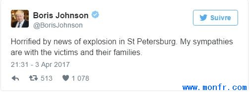 Le président russe Vladimir Poutine a présenté "ses condoléances" aux victimes lors d'une courte intervention télévisée. Par ailleurs, le Kremlin a tweeté que "toutes les mesures allaient être prises pour fournir de l'assistance aux personnes touchées par l'explosion de Saint-Pétersbourg."俄罗斯总统普京在简短的电视新闻报道中表达了对遇难者的哀悼。此外,克林姆林宫官方推特表示:我们将会尽一切所能帮助在圣彼得堡爆炸案中受伤的人们。