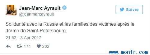 Le chef de l'Etat François Hollande et le ministre des Affaires étrangères Jean-Marc Ayrault ont exprimé leur "solidarité" avec la Russie.法国总统奥朗德与法国外交部长让-马克·艾罗表达了对俄罗斯的慰问。