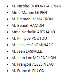 符合以上要求的合格候选人名单由宪法委员会公布。2017年3月18日,法国宪法委员会主席洛朗·法比尤斯(Laurent Fabius)公布了符合条件的11位候选人名单,这11个人分别是: