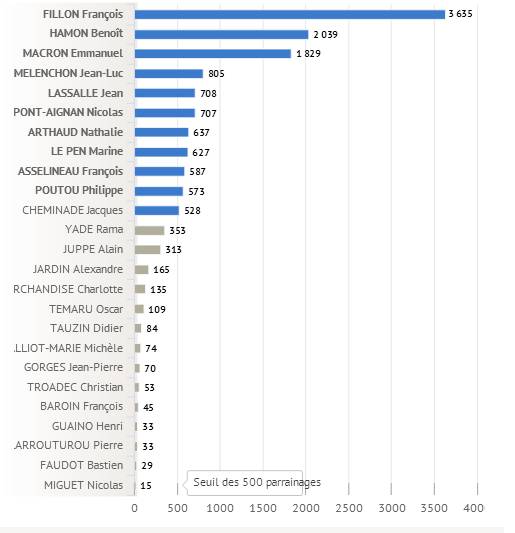1. 获得500个以上民选代表的签名(500 signatures/parrainages), 他们必须来自至少30个不同的省或海外领地。这些签名随后会受到法国宪法委员会(Conseil constitutionnel)的审查。下图是截至2017年3月18日parrainages的收集情况: