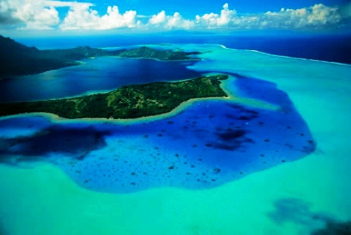 波拉波拉珊瑚礁位于南太平洋上,是法属玻利尼西亚社会群岛中下风向群岛的一部分。在700万年前,这里曾经是一座死火山,火山下沉后残留下来的遗迹周围形成了一圈珊瑚礁。从空中鸟瞰波拉波拉珊瑚礁,清澈的泻湖呈现出梦幻般的蓝色,泻湖之中生活着数百种热带鱼。波拉波拉珊瑚礁最著名的景点,就是洁白如雪的沙滩和两座高峰,即奥特玛努山和帕西亚山。