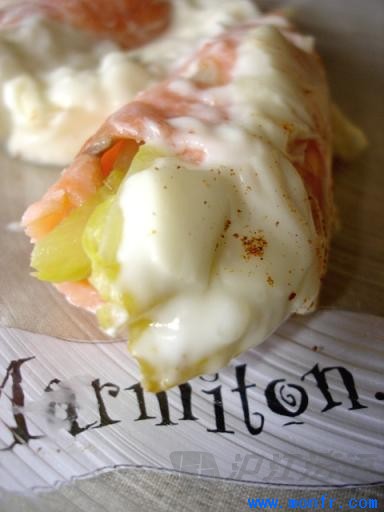 把每片烟熏三文鱼片都切成两半,把切好的每半片三文鱼包入苦苣(切成块哦)卷起来。