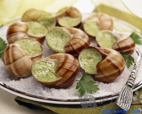 Les escargots de Bourgogne sont un mets traditionnel de la cuisine bourguignonne. L'escargot, logé au fond de la coquille, est recouvert de beurre additionné de persil haché et d'ail pilé, puis passé au four.Les escargots de Bourgogne sont consommés depuis la préhistoire ; de nombreuses coquilles ont été retrouvées sur les sites de fouilles archéologiques.L'espèce étant protégée en France, l'escargot de Bourgogne vient essentiellement de Grèce et des pays de l'Est.勃艮第焗蜗牛 是勃艮第地区传统美食, 蜗牛肉置于壳底部,上面覆盖加入切碎的香芹、捣碎的蒜末的黄油,然后在烤箱里烘烤。勃垦第焗蜗牛历史悠久,可以追溯到史前时代,,曾经在古代遗址中就发现过一些蜗牛壳。蜗牛在法国是受到保护的物种,所以勃艮第的蜗牛主要来自希腊和一些东欧国家。