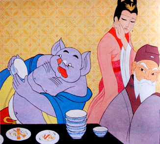Mais aves le temps, le visage du gendre se modfie peu à peu : d’abord, ses oreilles s’allongent, puis sa bouche s’afrandit et du poil lui pousse sur la nuque. Finalement ;il se transforme complètement en cochon. En ourte, il montre un appétit de loup et mange de trois à cinq boisseaux de riz par repas. Le Vieux Gao devient soucieux.